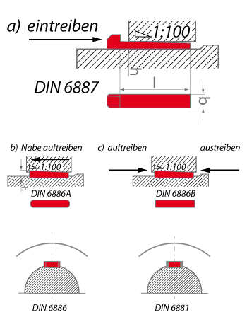 Hohlkeile (DIN 6881 und 6889) sind an der unteren Fläche gerundet, so dass sie auf dem Wellendurchmesser aufliegen (Kraftübertragung daher über Reibschluss).