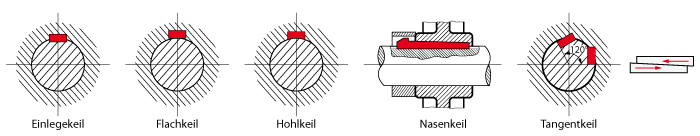 Es gibt verschiedene Arten von Keilen, die sich aber in Form und Querschnitt unterscheiden (siehe Bild unten). Die verschiedenen Keilarten werden durch die DIN 6881 (Hohlkeile), DIN6883 (Flachkeile), DIN 6886, DIN 6884 (Nasenflachkeile), DIN 6889 (Nasenhohlkeile) festgelegt.